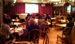 そして今年も「東京音頭」は踊りもアリでにぎやかに盛り上がりました。踊りの得意な数名の方々が、大テーブルの周囲を踊りながら廻ってくれ、他のみんなも手拍子をしながら楽しく歌いました。